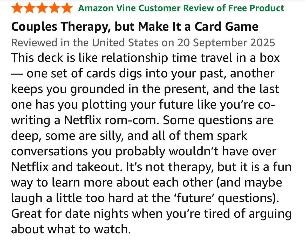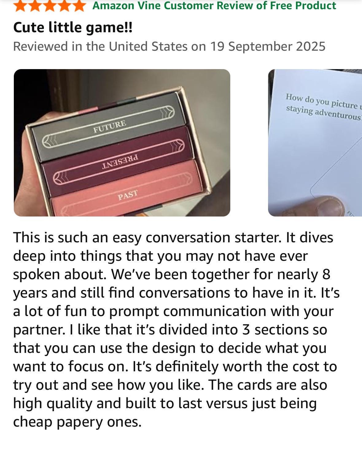 ✅ EASY TO PLAY, NO COMPLICATED RULES – Simply pick a card from the Past, Present, or Future deck, take turns answering, and enjoy eye-opening discussions with your partner.